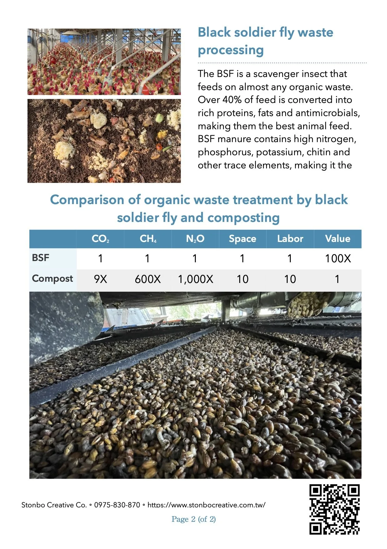 Up to 400 kg fully grown fresh larvae and 800 kg larvae frass can be produced each day. The fresh larvae can be used directly as fresh feed or further processed into dried pellets or refined into biodiesel, C10 fatty acids, chitosan, melanin, bio-plastics, and many more. Larvae frass is a high quality source of fertilizer and can be directly used in the land.
